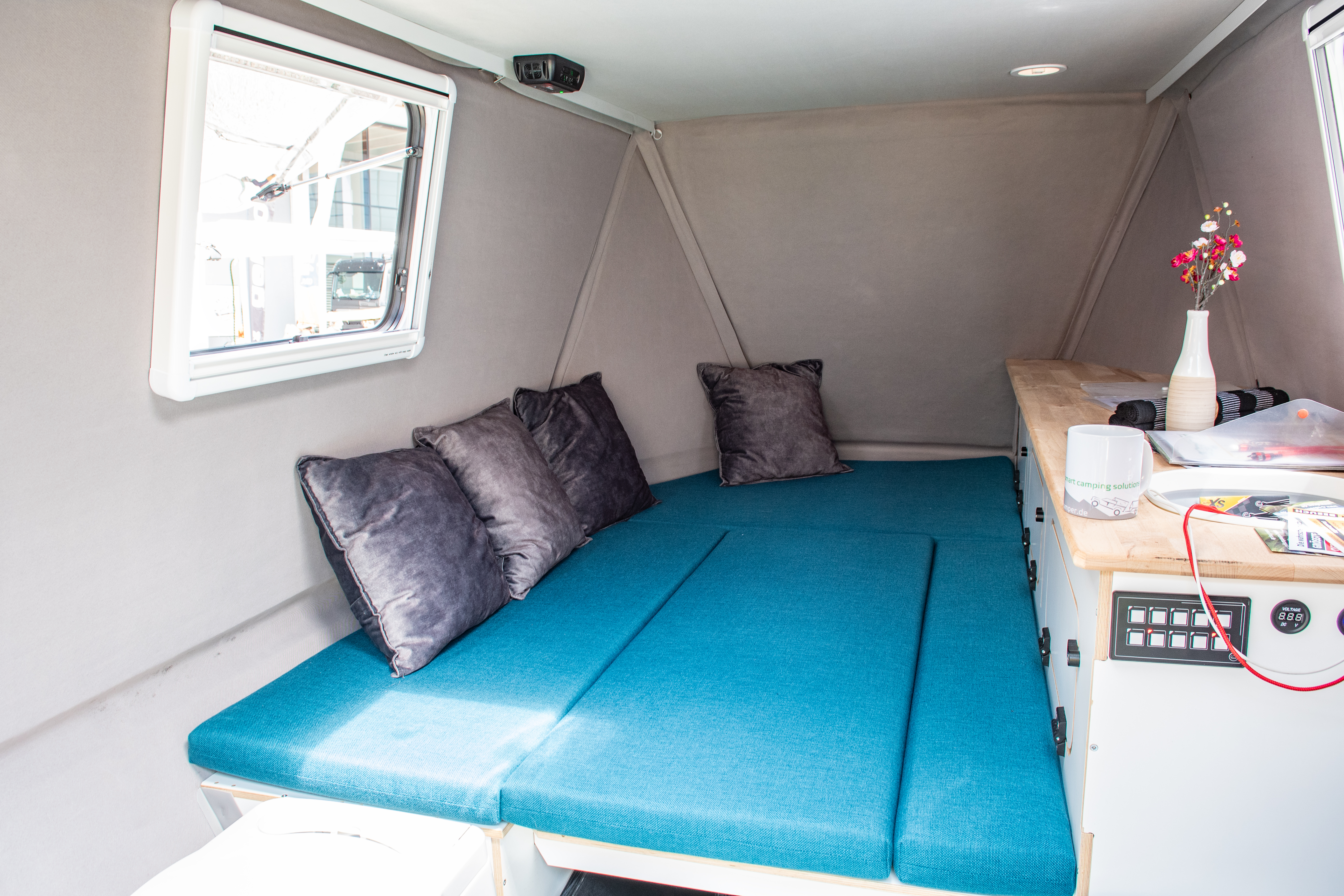 Der wohnliche und für zwei bis drei Personen ausreichende Innenraum des Origami Ronin kann schnell zum Schlafzimmer werden. Bild: YUB-Camper/Jerôme Herr